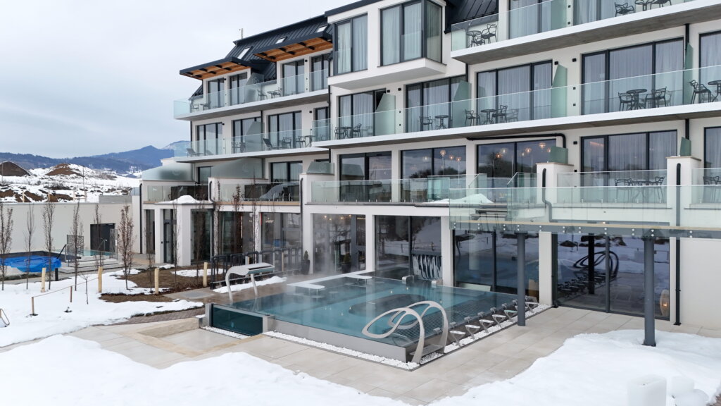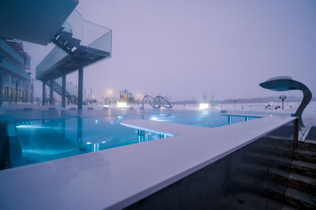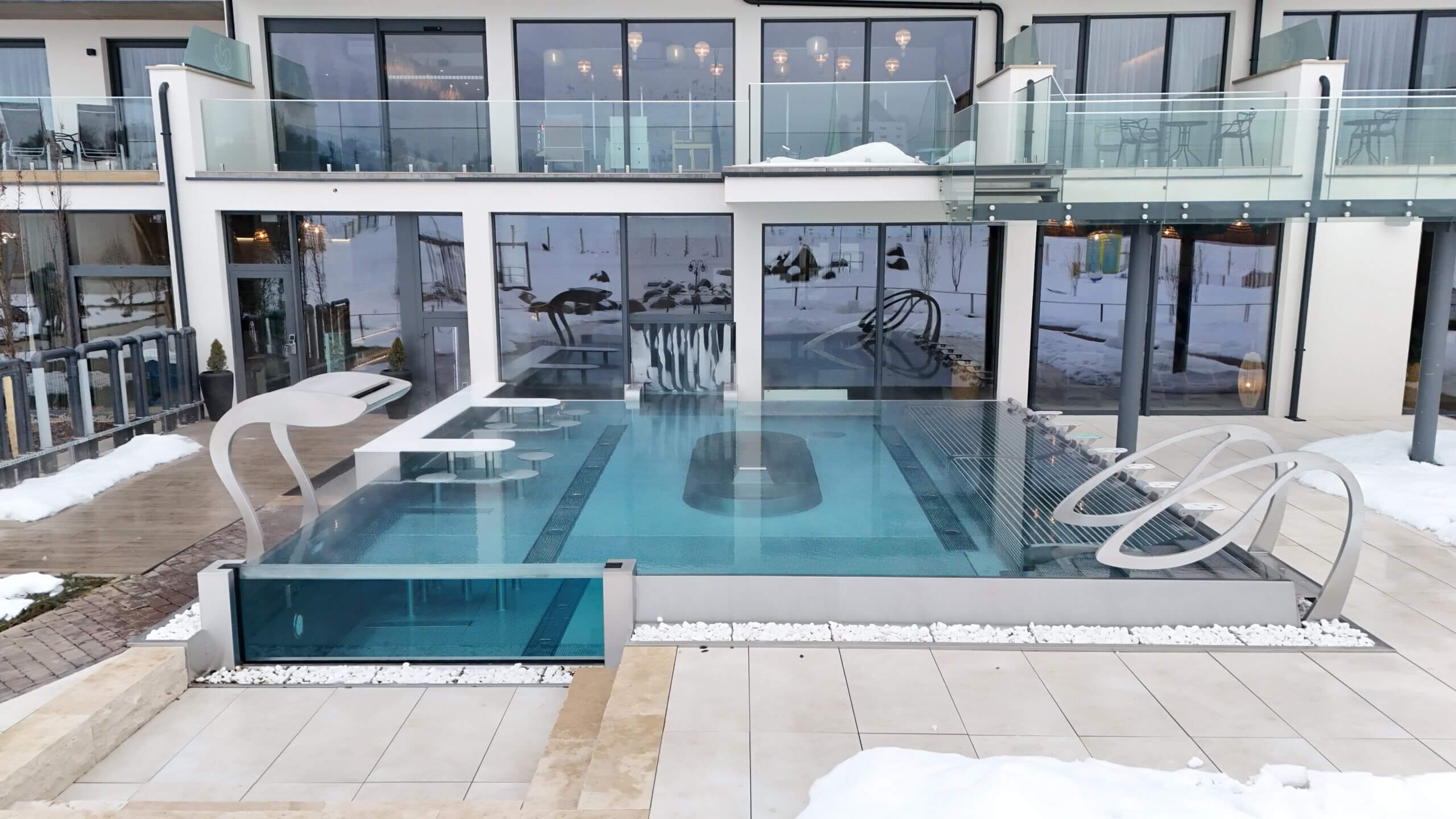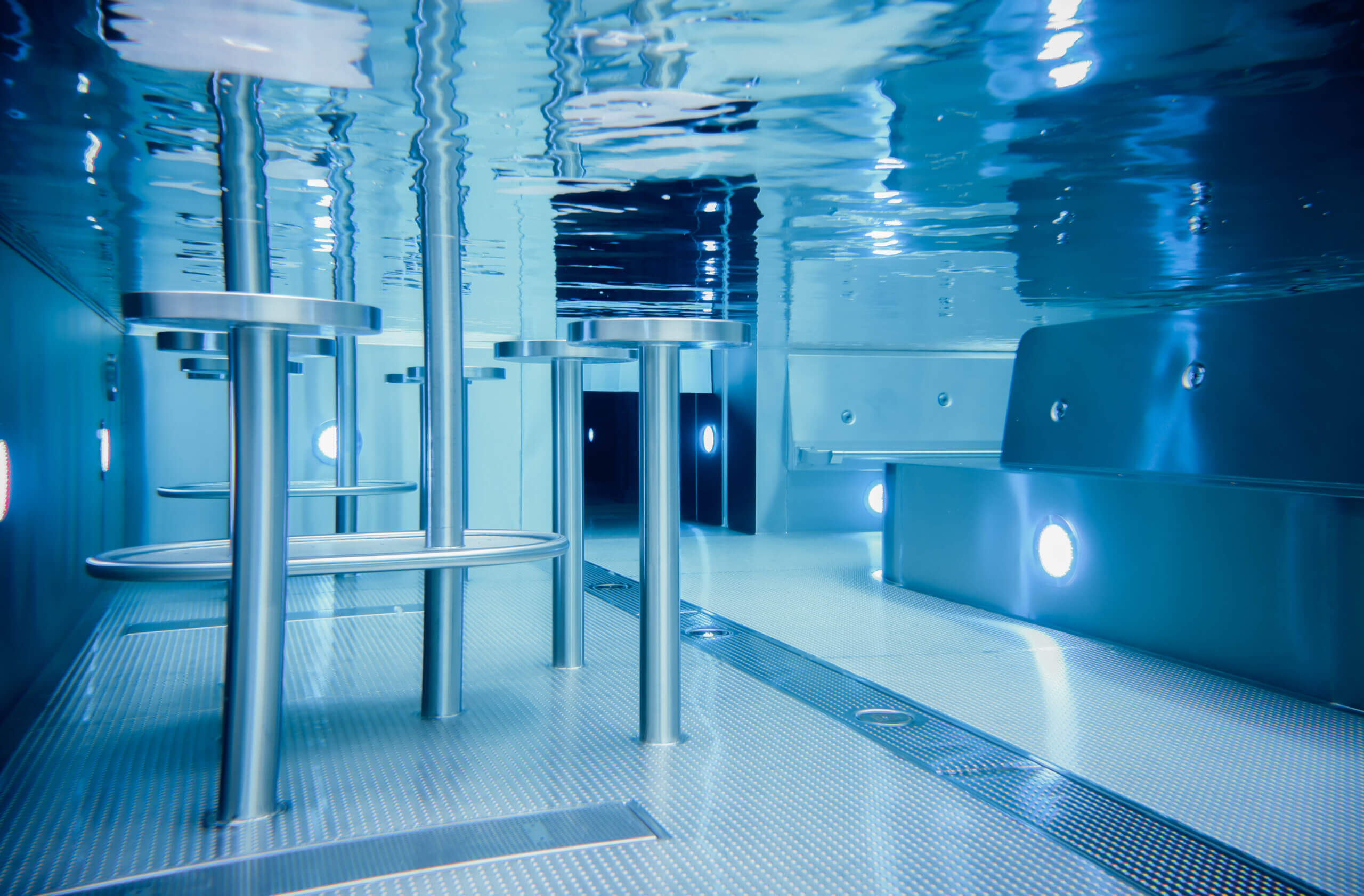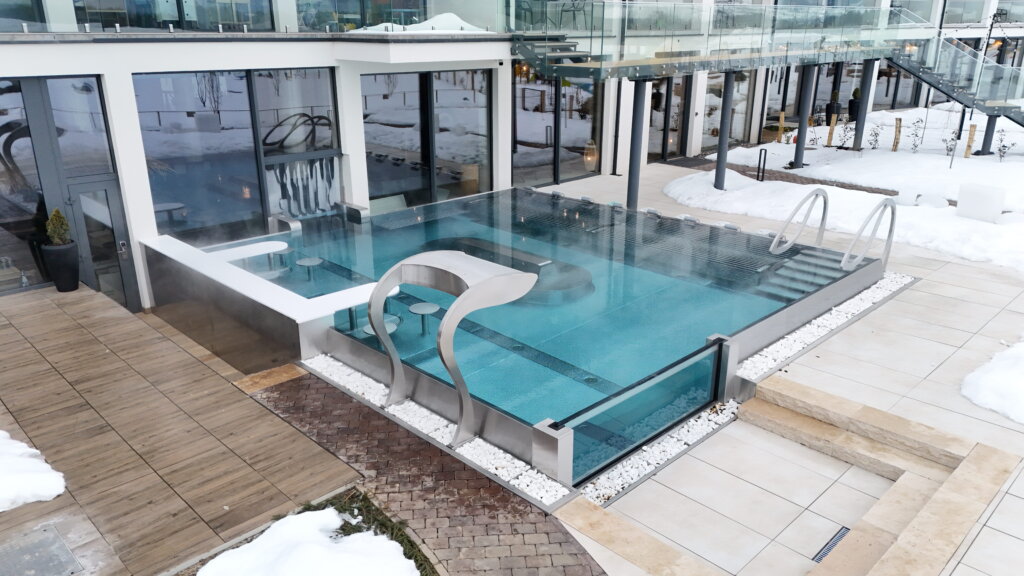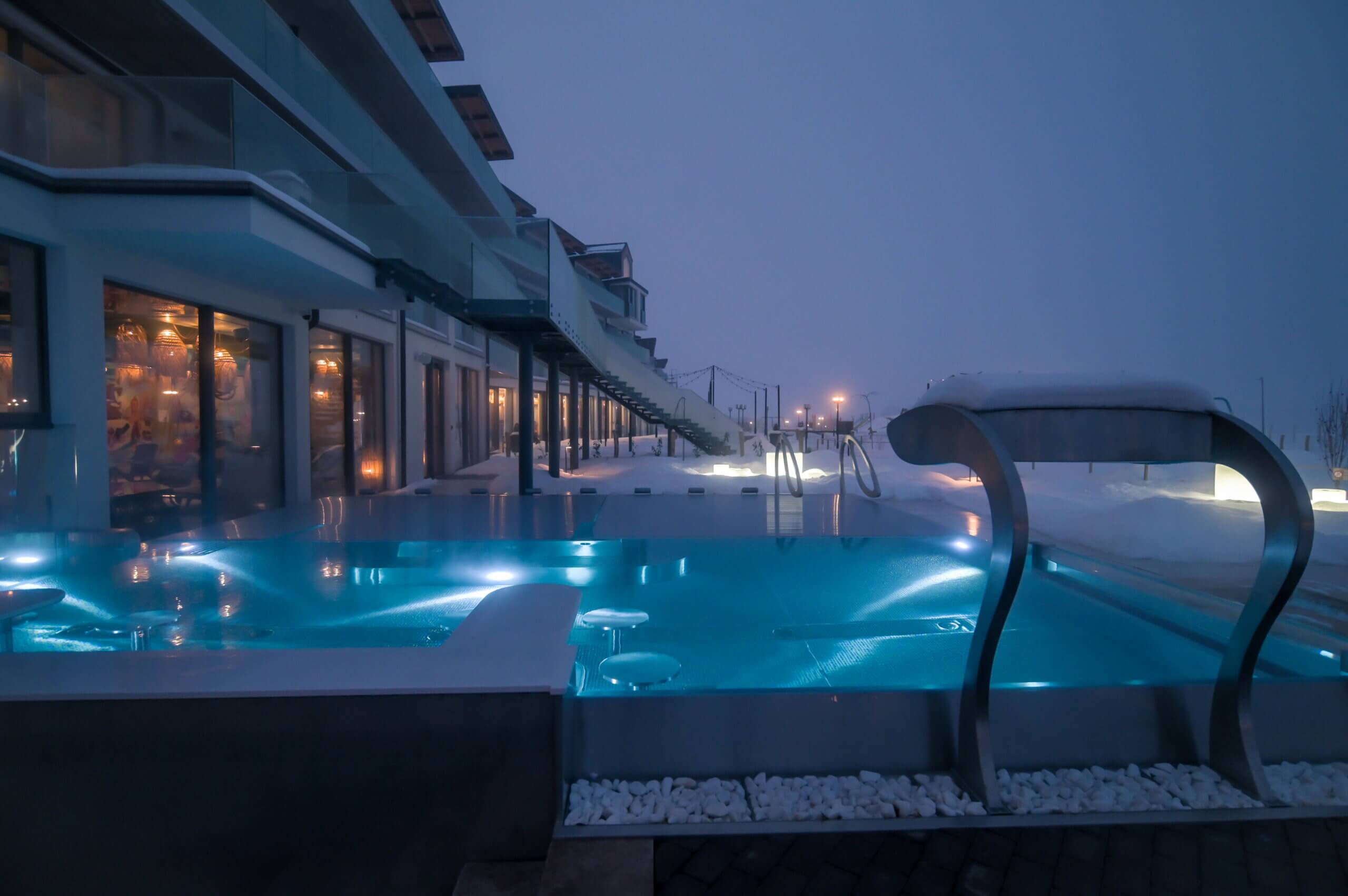 V areáli Lake Garden Tatralandia sme realizovali výnimočný relaxačný viacúčelový bazén s infinity prelivom, ktorý spája čistý dizajn, prémiové spracovanie a bohatú výbavu atrakcií. Celý koncept je navrhnutý tak, aby pôsobil maximálne elegantne, s minimom rušivých prvkov a s dôrazom na zážitok z vody, svetla a detailu. Dominantou bazéna je infinity preliv doplnený o dizajnové prekrytie žľabov – kamene osadené v nerezových profiloch, ktoré prirodzene zapadnú do celkovej architektúry. Zároveň sme mysleli aj na praktickú stránku prevádzky: vodná plocha je chránená podhladinovou PVC roletou, ktorá je šikovne skrytá pod ležadlom a schodiskom, takže pri používaní nijako nenarúša estetiku. Už pri vstupe do vody návštevník cíti, že ide o bazén navrhnutý „na mieru“ aj v detailoch: votknuté schodisko pôsobí ľahko a čisto, a dopĺňajú ho dizajnové nerezové madlá vyrobené na mieru - prvky, ktoré nie sú len technickým doplnkom, ale plnohodnotnou súčasťou dizajnu. Rovnako aj ďalšie komponenty (madlá, opierky hlavy, podstavce na poháre či detaily pri relax zónach) boli navrhnuté individuálne našimi dizajnérmi tak, aby ladili s charakterom miesta a zároveň vydržali intenzívnu prevádzku. Srdcom bazéna je premyslená relaxačná scenéria, ktorá ponúka viacero spôsobov oddychu. Komfort zabezpečujú rúrkové ležadlá a sedadlá so vzduchovou masážou, doplnené o opierky hlavy a praktický stojan na poháre. Voda pracuje s telom v rôznych režimoch: hydromasážne trysky zapustené do steny bazéna a dnová vzduchová perlička vytvárajú príjemnú masáž a uvoľnenie. Výrazným zážitkovým prvkom je ostrovček v strede bazéna – kompaktná relaxačná zóna, kde si viete dopriať vzduchovú aj hydromasáž. A keď máte chuť prepnúť z relaxu na spoločenský moment, plynulo nadviaže bar zóna s barovým pultom, 2 barovými stolíkmi a 8 barovými stoličkami – ideálne miesto na oddych na hladine aj mimo nej. Bazén je navrhnutý aj tak, aby ponúkol variabilitu podľa počasia či preferencií hostí: vďaka žalúzii na oddelenie vnútorného a vonkajšieho bazéna je možné pohodlne prejsť do vnútornej časti a užívať si relax v každom ročnom období. Emóciu a atmosféru dotvárajú vizuálne dominanty. Efektný vodopád / chrlič vody je zároveň výnimočný tým, že ide o prvok vytvorený umelcom – v praxi teda nie je len funkčnou atrakciou, ale aj umeleckým dielom, ktoré podčiarkuje výnimočnosť celej realizácie. Silný vizuálny podpis dopĺňa aj akrylátová stena integrovaná do nerezového telesa, ktorá dodáva bazénu ľahkosť a moderný charakter. Všetko dotvára podhladinové LED RGB-DMX osvetlenie, vďaka ktorému sa dá atmosféra priestoru meniť podľa nálady – od jemného ambientu až po výraznejšie farebné scény. Aj táto realizácia nesie náš Wonderwerk rukopis: dôraz na detail, funkčnosť, dizajn, a zároveň odolnosť riešení, ktoré majú vydržať a vyzerať výborne aj po rokoch.